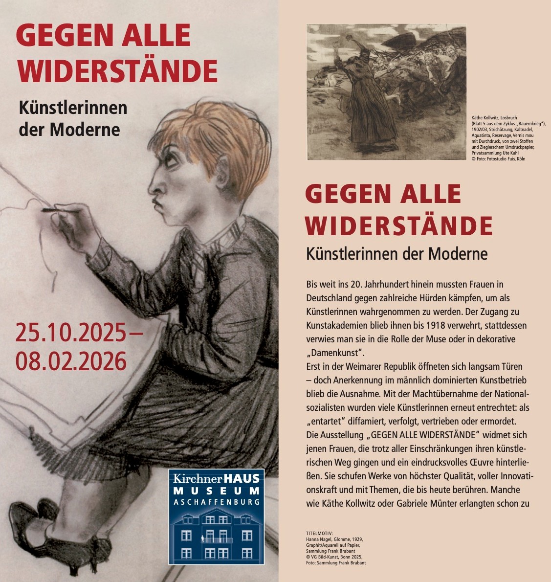 Führung durch die Ausstellung GEGEN ALLE WIDERSTÄNDE – Künstlerinnen der Moderne mit Anne Hundhausen und anschließendes Gespräch zum Thema: „Die Rolle der Frau im Handwerk der Steinmetzen und in der Kunst der Steinbildhauerei“. Im „Ludwig 17“ diskutieren Dr. Brigitte Schad (Leiterin KirchnerHAUS Museum) und Ulrike Ader (Leiterin der Städtischen Meisterschule für Steinbildhauerinnen und Steinbildhauer) dieses Thema mit Studierenden der Aschaffenburger Meisterschule und den Teilnehmenden der Veranstaltung bei Kaffee und Kuchen.